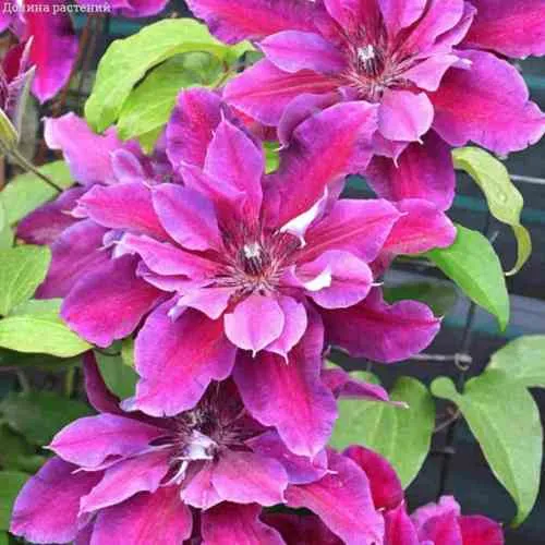 Цветки крупные, до 15 сантиметров в диаметре, окраска фиолетовая. Тычинки бело-пурпурно-розовые. Лепестки бархатистые и полумахровые. В среднем в цветке от 7-8 внешних лепестков и до 30 – внутренних.