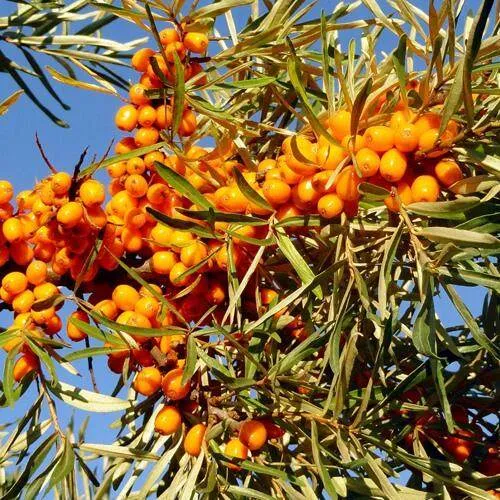 Саженцы растут в среднем до 300 см и формируют раскидистую крону, что делает их отличным элементом ландшафтного дизайна. Побеги толстые и прямые, но при этом абсолютно без колючек, что позволяет ухаживать за растением без лишних неудобств. Овальные янтарно-оранжевые ягоды, размером до 1,2х1 см и массой около 0,7 г, обладают сладко-кислым вкусом и высококачественным составом, содержащим 118 мг% витамина С.